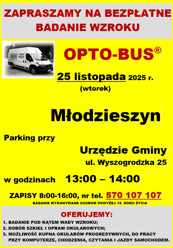 Opto-Bus zaprasza na bezpłatne badanie wzroku osoby powyżej 15 roku życia Badanie odbędzie się 25 listopada 2025 (wtorek) Parking przy Urzędzie Gminy Młodzieszyn. W godzinach 13:00 – 14:00 W ofercie: badanie pod kontem wady wzroku, dobór szkieł i opraw okularowych, możliwość kupna okularów progresywnych, do pracy przy komputerze, chodzenia, czytania i jazdy samochodem. Zapisy … Dowiedz się więcej